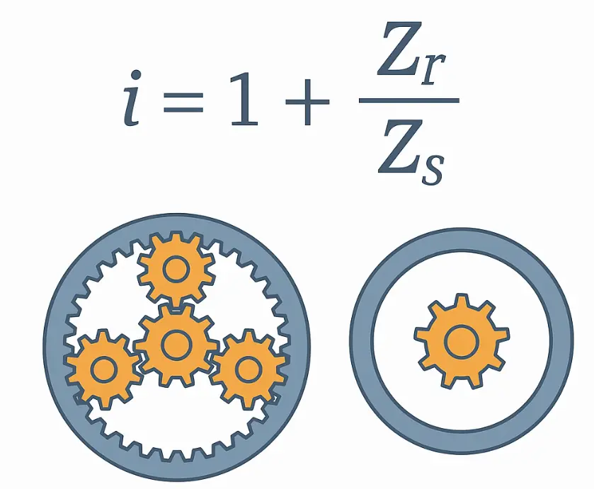 Для простого прикладу: якщо кількість зубів на сонячній шестерні дорівнює 20, а кількість зубів на внутрішньому кільці дорівнює 60, то передавальне число дорівнює: