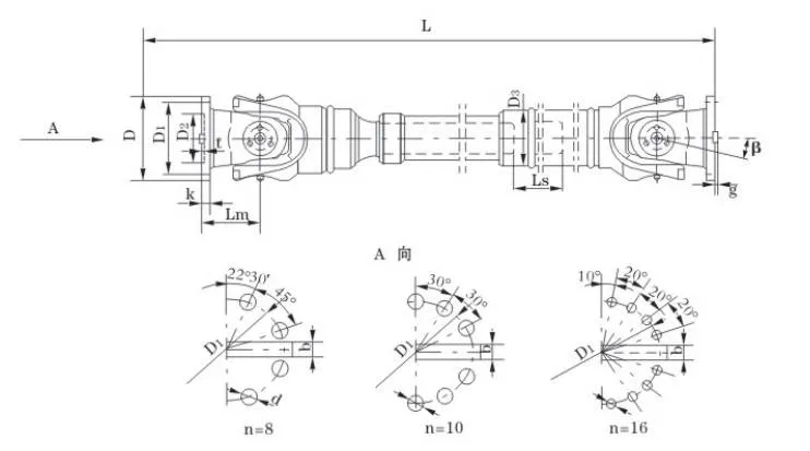 | немає | Діаметр обертання D мм | Номінальний крутний момент Tn KN·m | Кут згину осей β (°) | Втомлений крутний момент Tf KN·m | Кількість згинання Ls мм | Розмір (мм) | Інерція обертання кг.м2 | Вага (кг) | |||||||||||